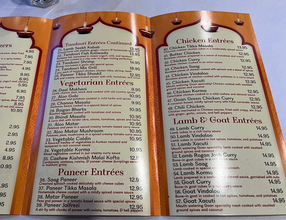 For lamb enthusiasts, the menu boasts an array of lamb entrees that are not to be missed. Options like Lamb Saag, featuring lamb cooked in a rich cream spinach sauce, or the fiery Lamb Vindaloo with its hot spices and tangy tomatoes are sure to tantalize your taste buds—all priced around $17.99 to $18.99.